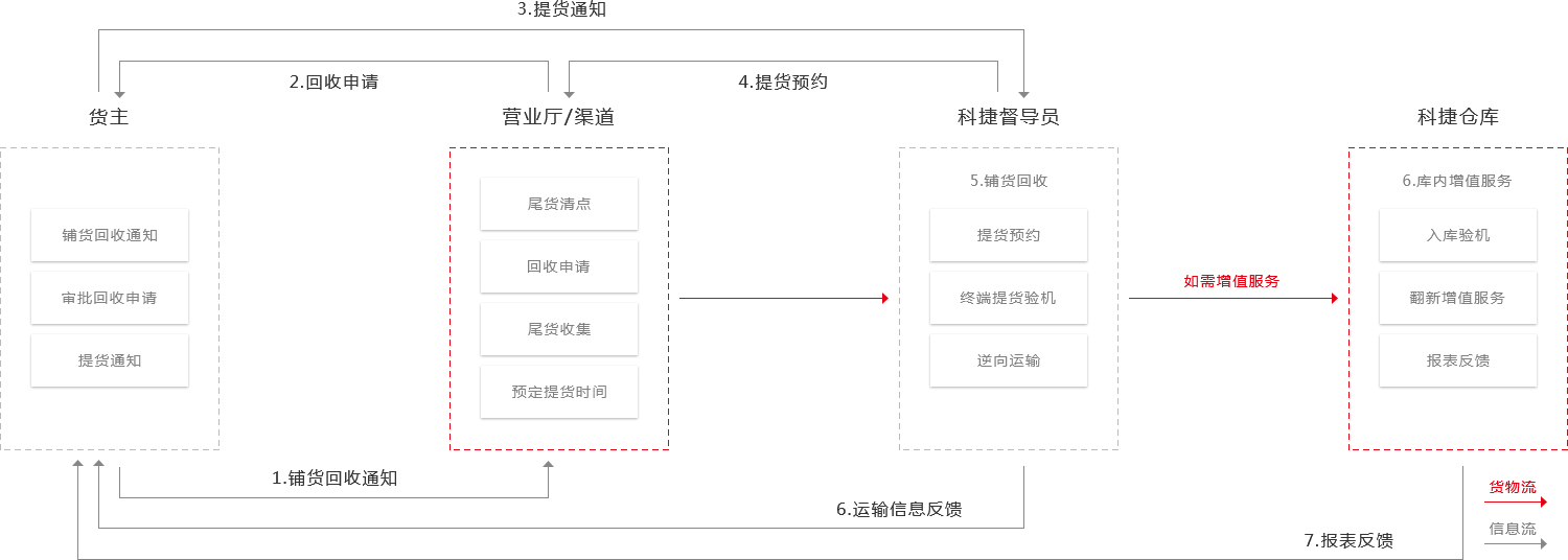 科捷物流為客戶提供演示機(jī)回收、鋪貨回收、消退回收、拒收回收、維修機(jī)回收返回中心倉(cāng)/省倉(cāng)/地級(jí)市倉(cāng)、營(yíng)業(yè)廳/渠道調(diào)撥的逆向物流服務(wù),并在提貨終端提供貨品質(zhì)檢、序列號(hào)校驗(yàn)、更換配件和外包裝、軟件升級(jí)等增值服務(wù)。